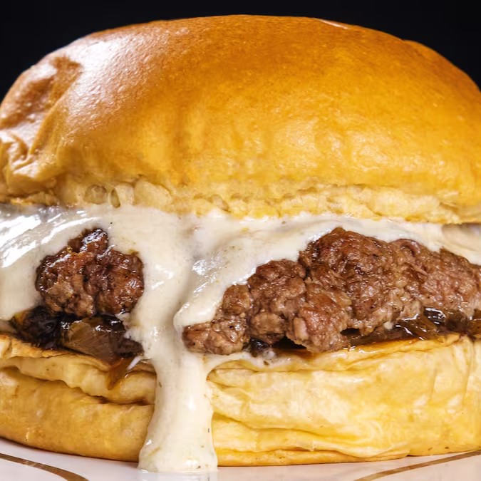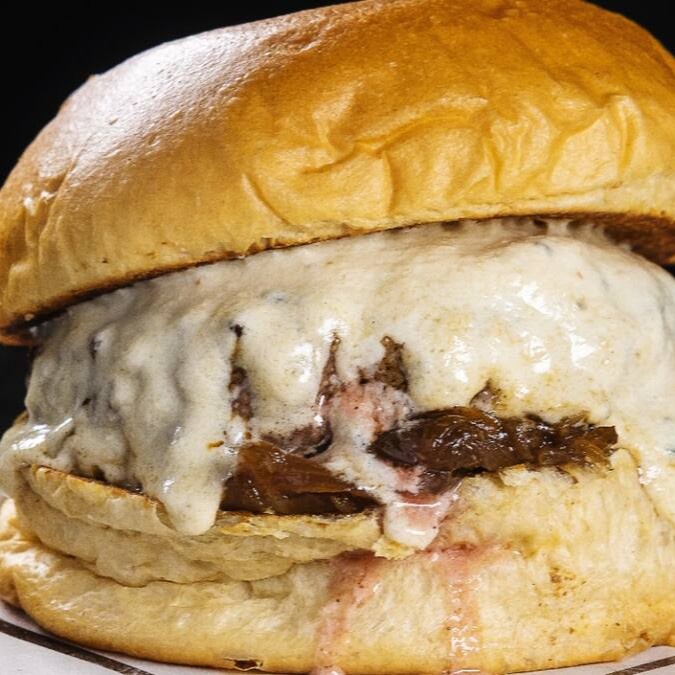 Pão brioche, smash 100 g com uma crostinha incrível, fonduta de gorgonzola e cebola caramelizada.
