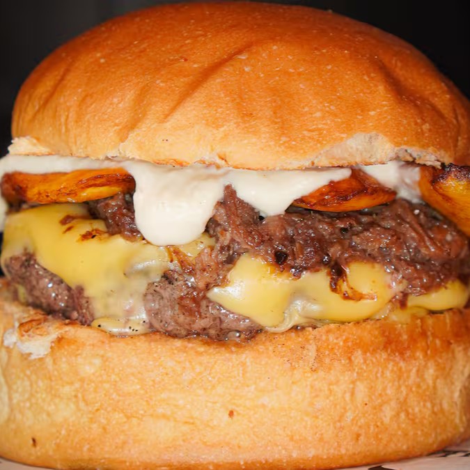 Pão brioche, blend 160g, queijo prato, costela desfiada, banana da terra e maionese defumada