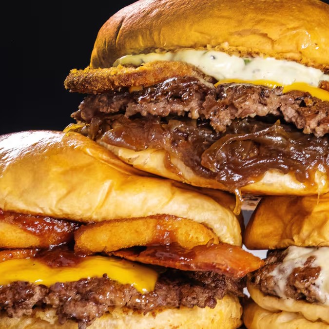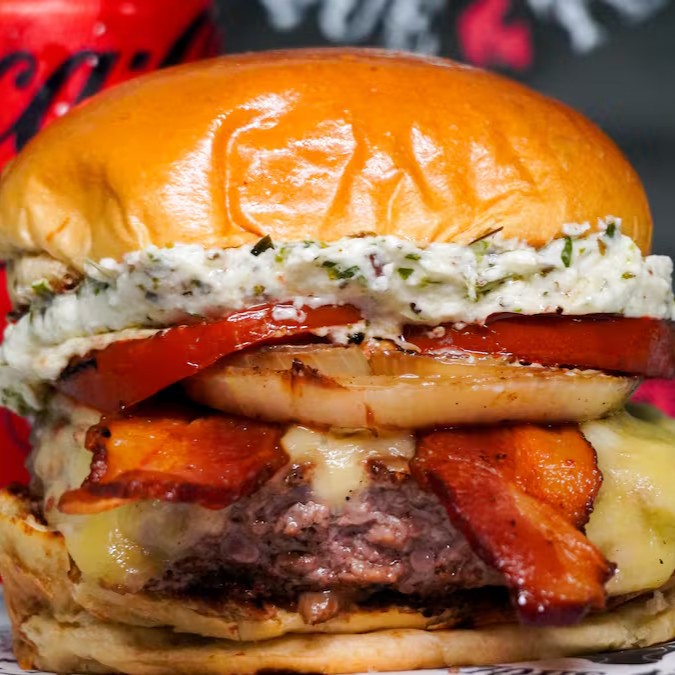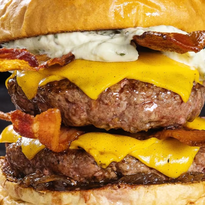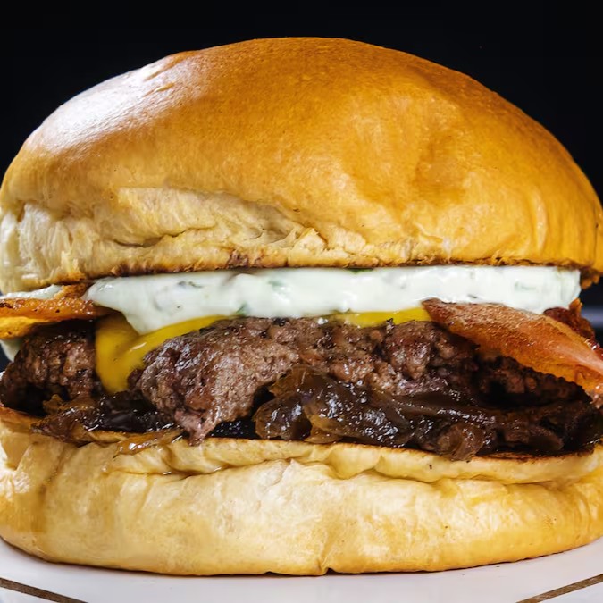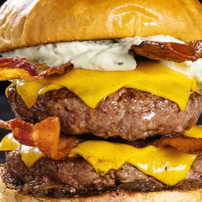 Pão brioche, 2 blends 160g, 4 fatias de cheddar, bacon , cebola caramelizada e aioli de ervas