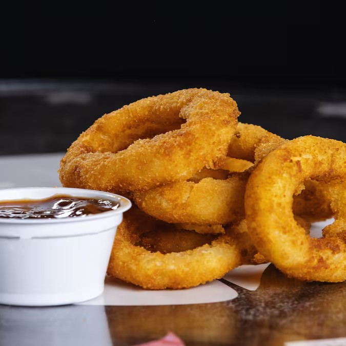 Anéis de cebola super crocantes acompanhados de molho barbecue.