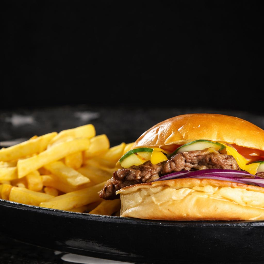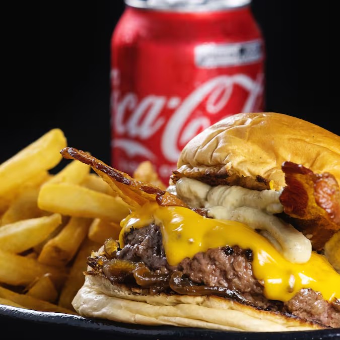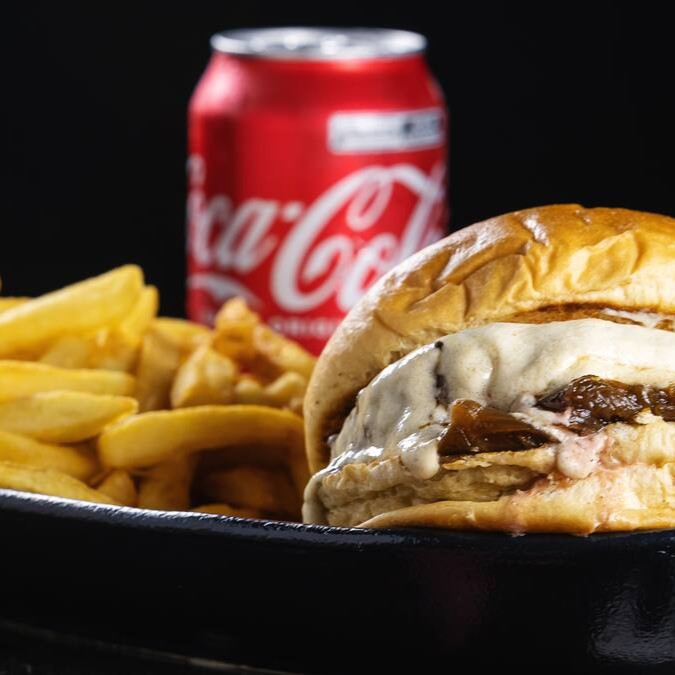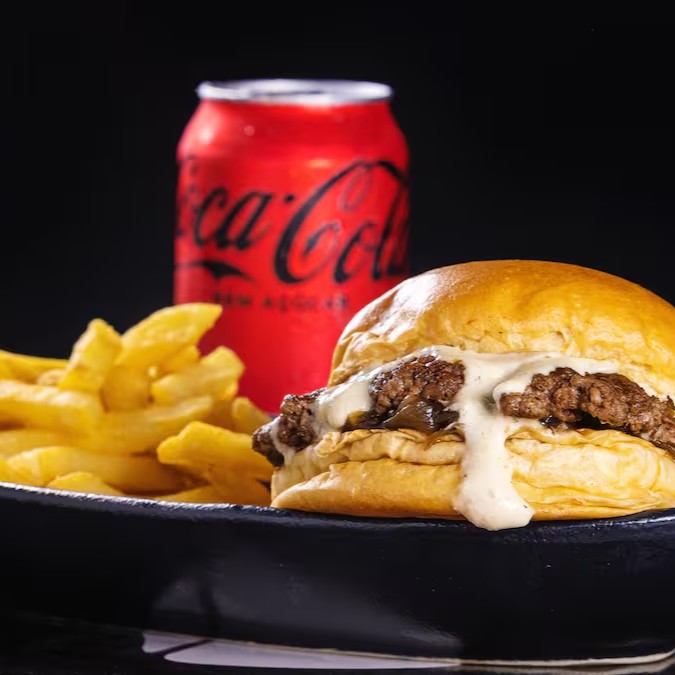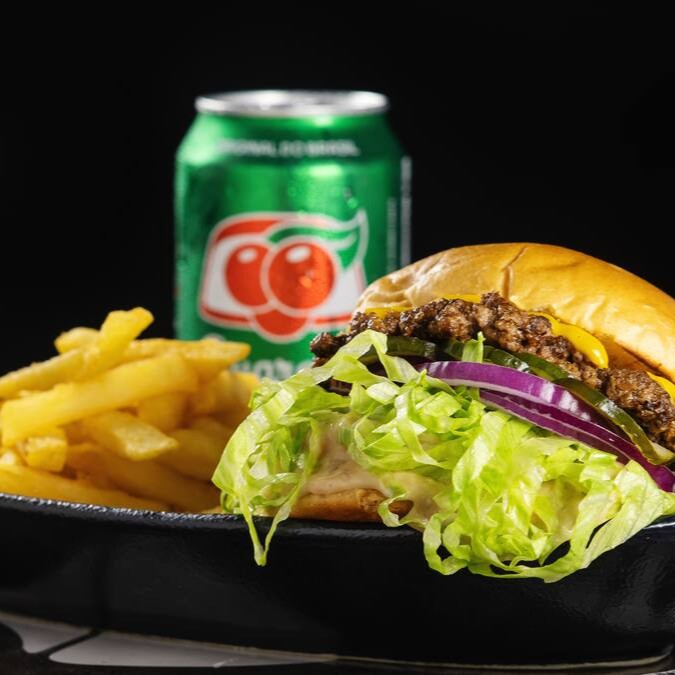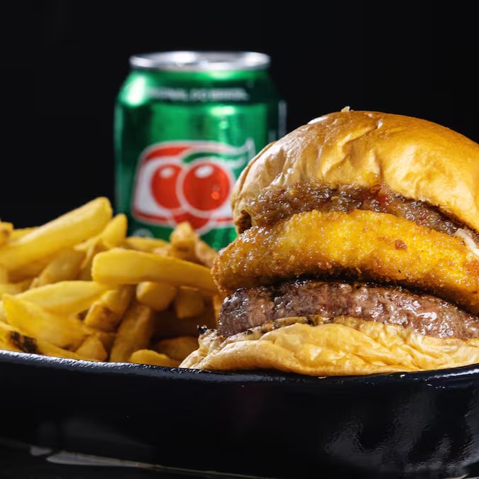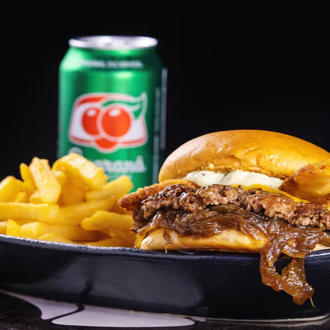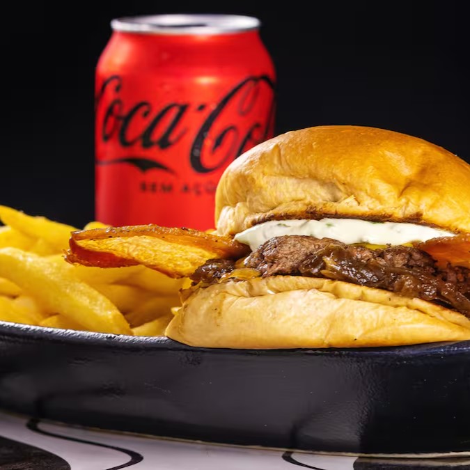 Pão brioche, blend 160g, queijo prato, costela desfiada, banana da terra e maionese defumada acompanhado de batata frita e refrigerante.