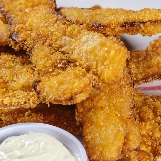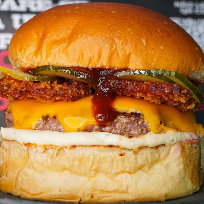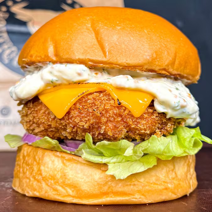 Pão brioche, blend 160g, cheddar, molho spicy (apimentado), bacon empanado, picles e maionese texana.