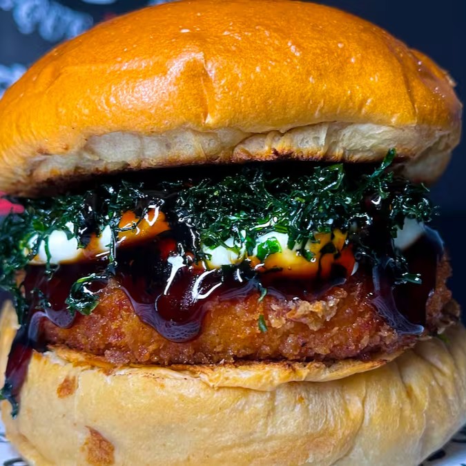 Pão Brioche, Frango Empanado, Cream Cheese, Couve Crispy, Molho Teriyaki.