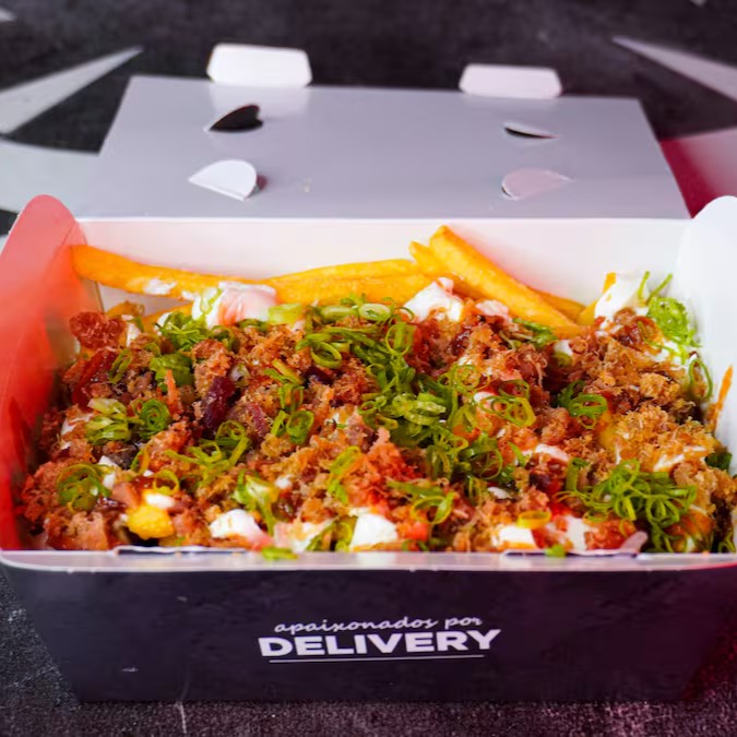 Batata Frita com Cream Cheese, Barbecue da Casa ou Molho Spicy - apimentado, Farofa de Bacon e Cebolinha.