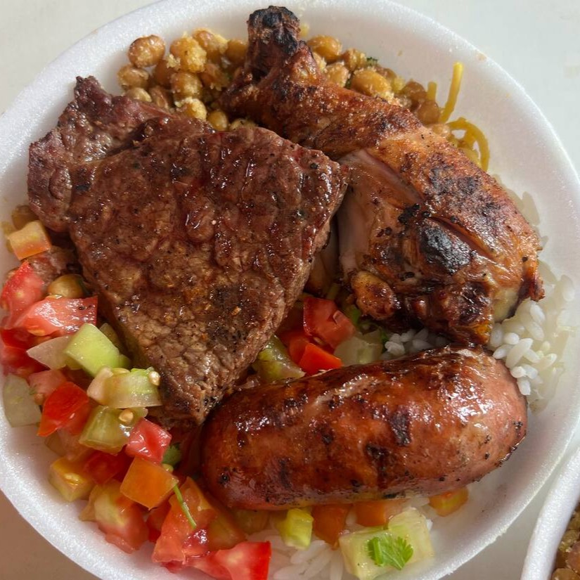 Alcatra com linguiça toscana. Acompanha arroz, feijão, macarrão, salada e farofa.
