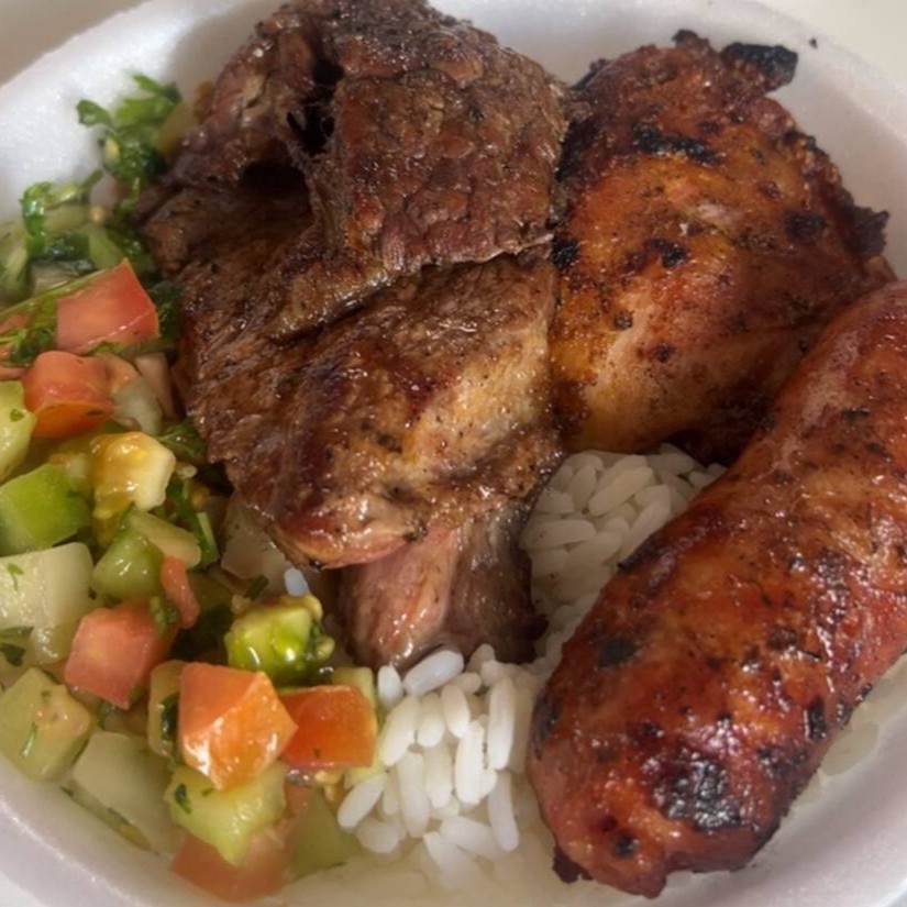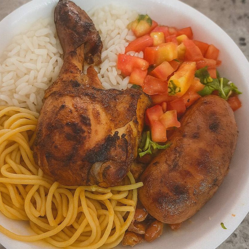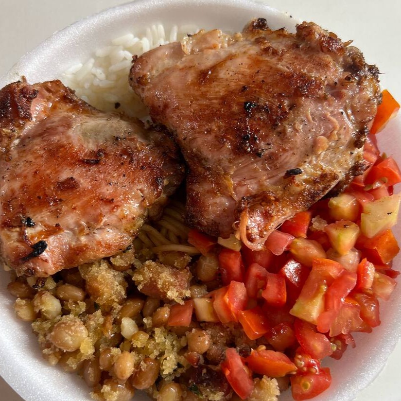 Sobrecoxa suculenta com linguiça toscana . Acompanha arroz, feijão, macarrão, salada e farofa.