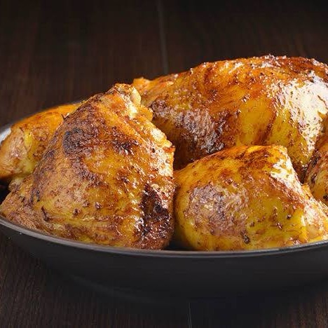 Duas sobrecoxas assadas. Acompanha arroz, feijão, macarrão, salada e farofa.
