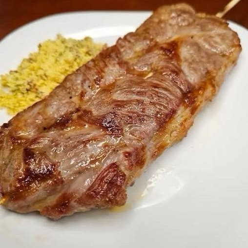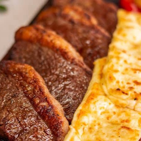 Picanha macia e suculenta, preparada com todo o sabor da brasa, acompanhada de arroz soltinho, salada fresca e feijão tropeiro bem temperado.