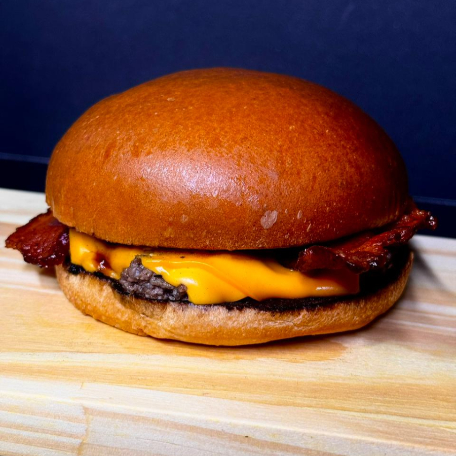 Saboroso Pão de batata, 70g de carne smash, queijo cheddar, barbecue e bacon.