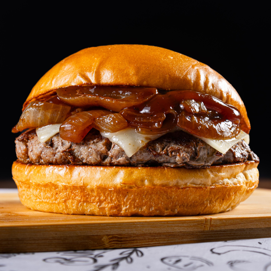Um saboroso Pão de batata, 130g de carne, cebola caramelizada, barbecue, queijo muçarela, melaço.