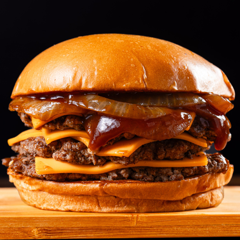 Pão de batata, 3 carnes smash, cheddar, cebola caramelizada e barbecue.