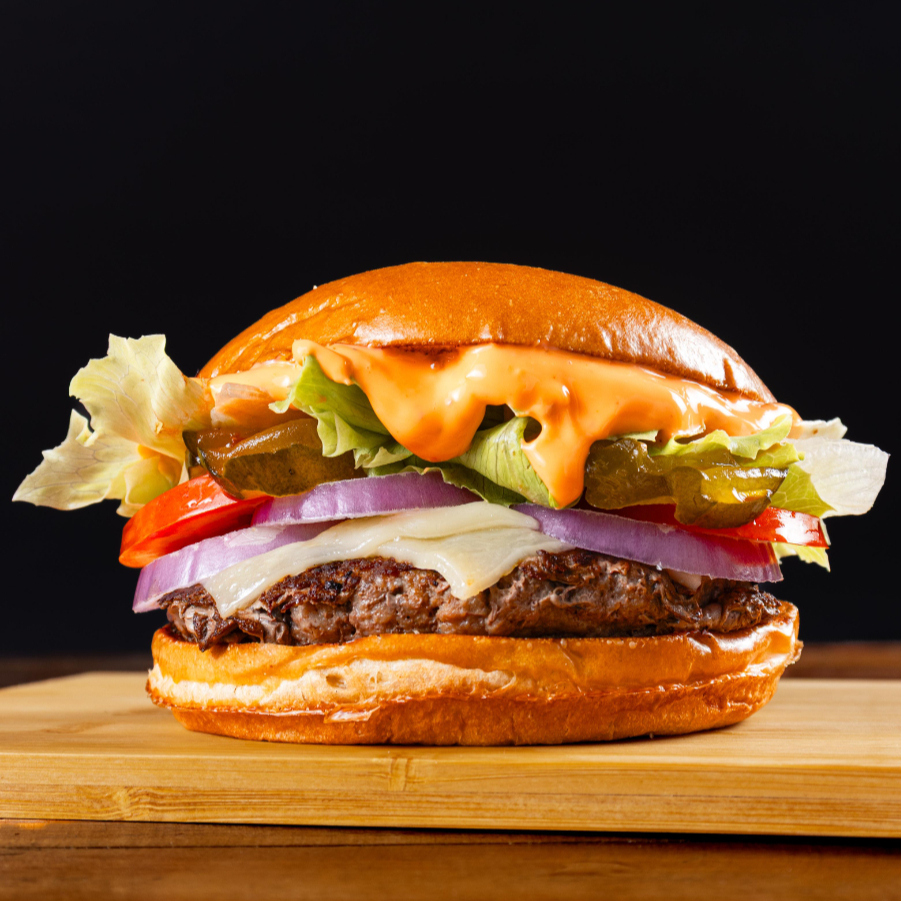 Delicioso Pão de batata,130g de carne , alface americano , tomate , cebola roxa , picles , maionese temperada , queijo muçarela.