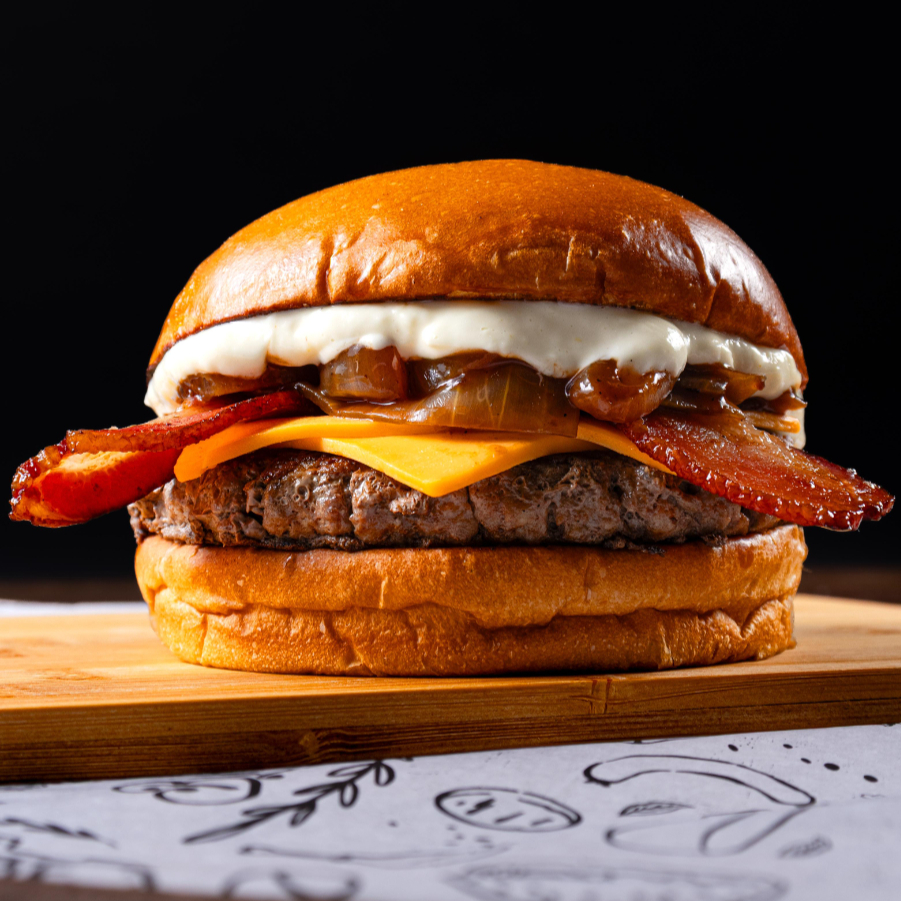 Delicioso Pão de batata,130g de carne, Queijo cheddar, cebola caramelizada, Maionese de alho e bacon.