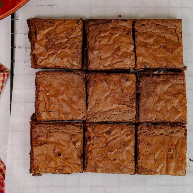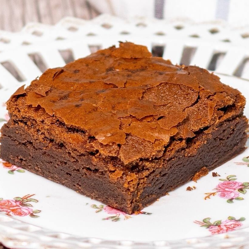 Brownie com casquinha crocante por fora e textura cremosa e macia por dentro.