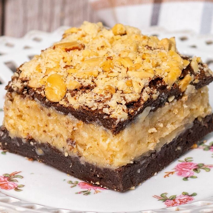Brownie tradicional recheado com brigadeiro de amendoim torrado e cobertura crocante de amendoim torrado. -----------------------tags-------------------------- brownie caseiro, brownie artesanal, brownie gourmet, brownie recheado brownie de Ninho, doce de leite, brigadeiro, sobremesa, delivery, bolos e doce, perto de casa, oferta, promo