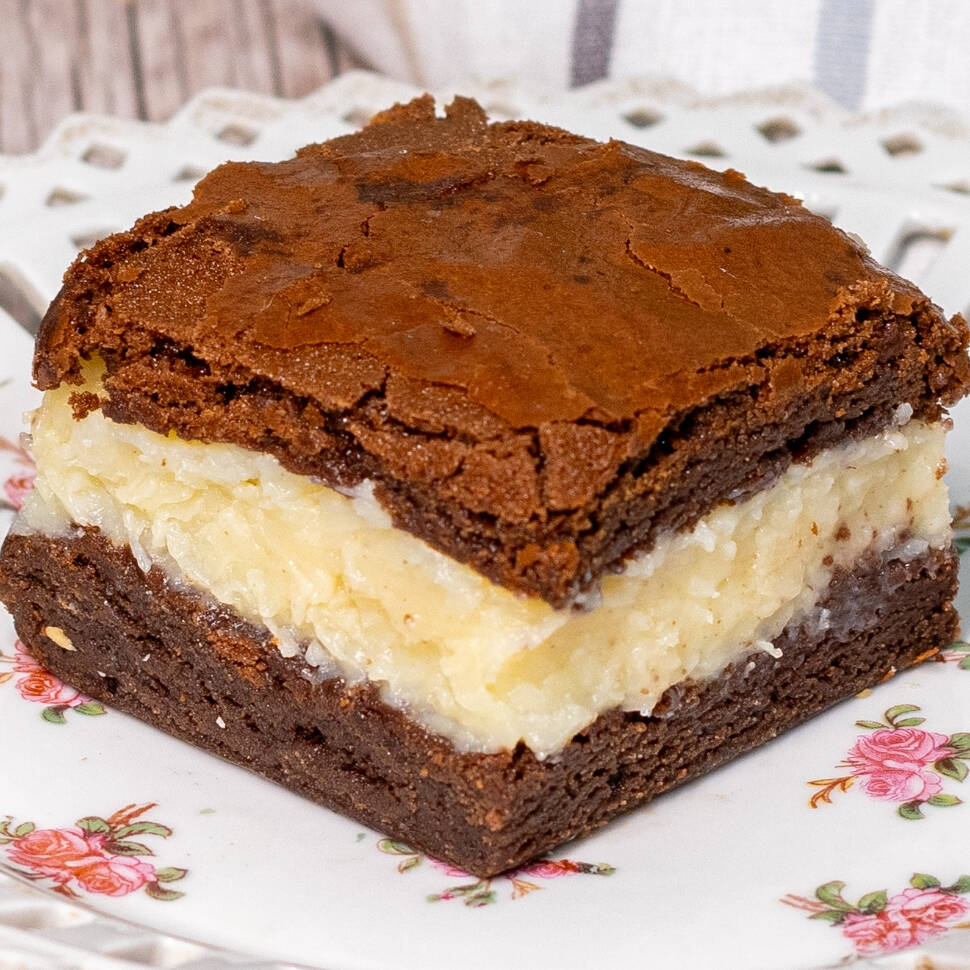 Brownie tradicional recheado com beijinho feito de coco seco natural. -----------------------tags-------------------------- brownie caseiro, brownie artesanal, brownie gourmet, brownie recheado brownie de Ninho, doce de leite, brigadeiro, sobremesa, delivery, bolos e doce, perto de casa, oferta, promo