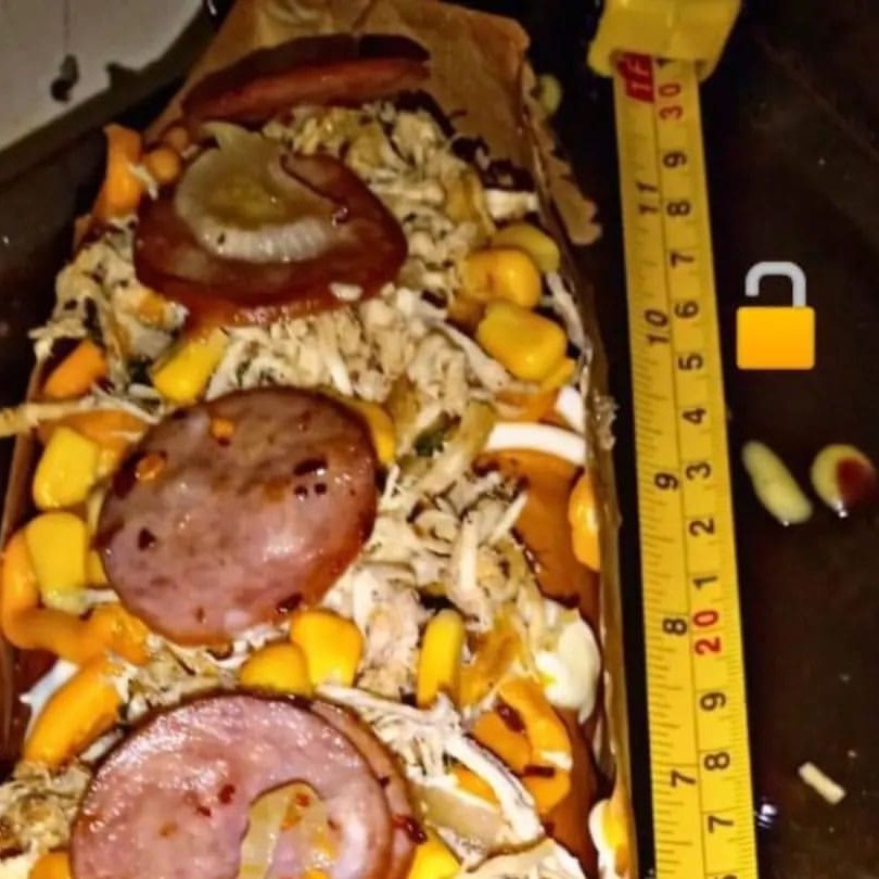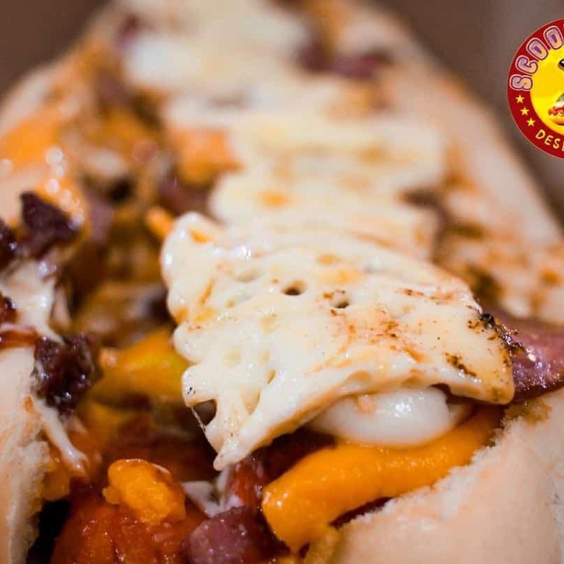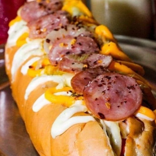 Cachorro-Quente Scoobydoo um Hot dog com pão de 30 cm 2 salsichas, calabresa fatiada, banana-da-terra flambada e queijo coalho, maionese temperada, ketchup, barbecue, mostarda, maionese tradicional, cheddar cremoso, Catupiry e batata palha crocante no seu dogão