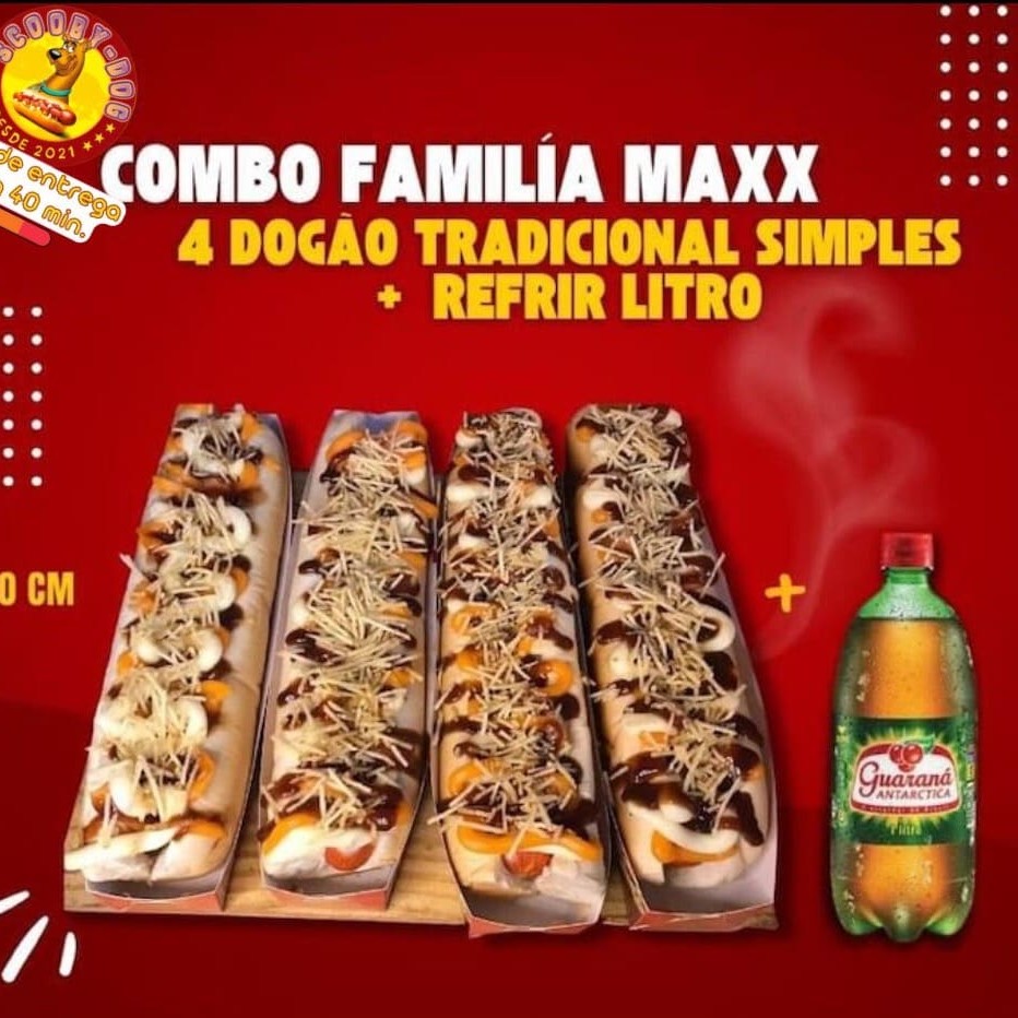 Conheça o Combo pague 1 leve 2 ao comprar um Scoobydogxtudo que compõe pão de 30cm 4 suculentas salsichas, bacon crocante, calabresa fatiada frango desfiado queijo coalho, ketchup, mostarda, maionese temperada, cheddar cremoso, Catupiry , barbecue , mostarda , maionese , molho especial batata palha você ganha de forma Gratuita um dogao tradicional com pão de 30cm que compõe Catchup , maionese , mostarda barbecue,maionese temperada & batata palha