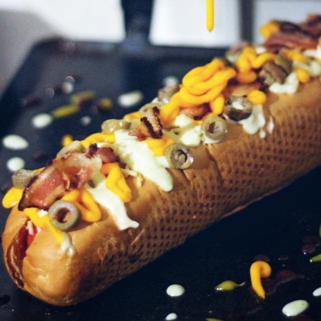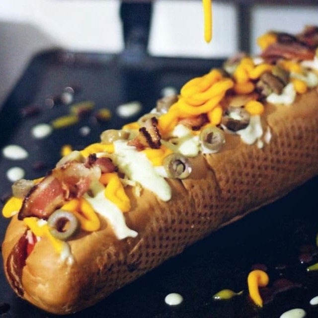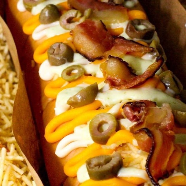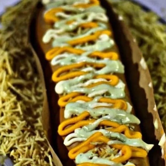 Cachorro-Quente Daphne, um dogao com pão de 30 cm,2 salsichas, calabresa fatiada, maionese temperada, maionese tradicional, mostarda, ketchup, barbecue, cheddar cremoso, molho especial, Catupiry e batata palha. Explosão de sabor no seu hot dog