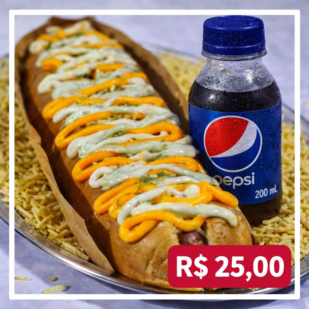 Combo Casal: Dois dogões de 30 cm com duas salsichas, recheados com ketchup, maionese, cheddar cremoso, Catupiry, mostarda, molho especial, maionese temperada artesanal e batata palha. E para completar, uma Pepsi totalmente grátis Combo perfeito para quem quer matar a fome juntos!