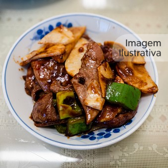 Deliciosa carne do sol (300g) que derrete na boca, regada com cebola, com acompanhamento de farofa de bacon e vinagrete.