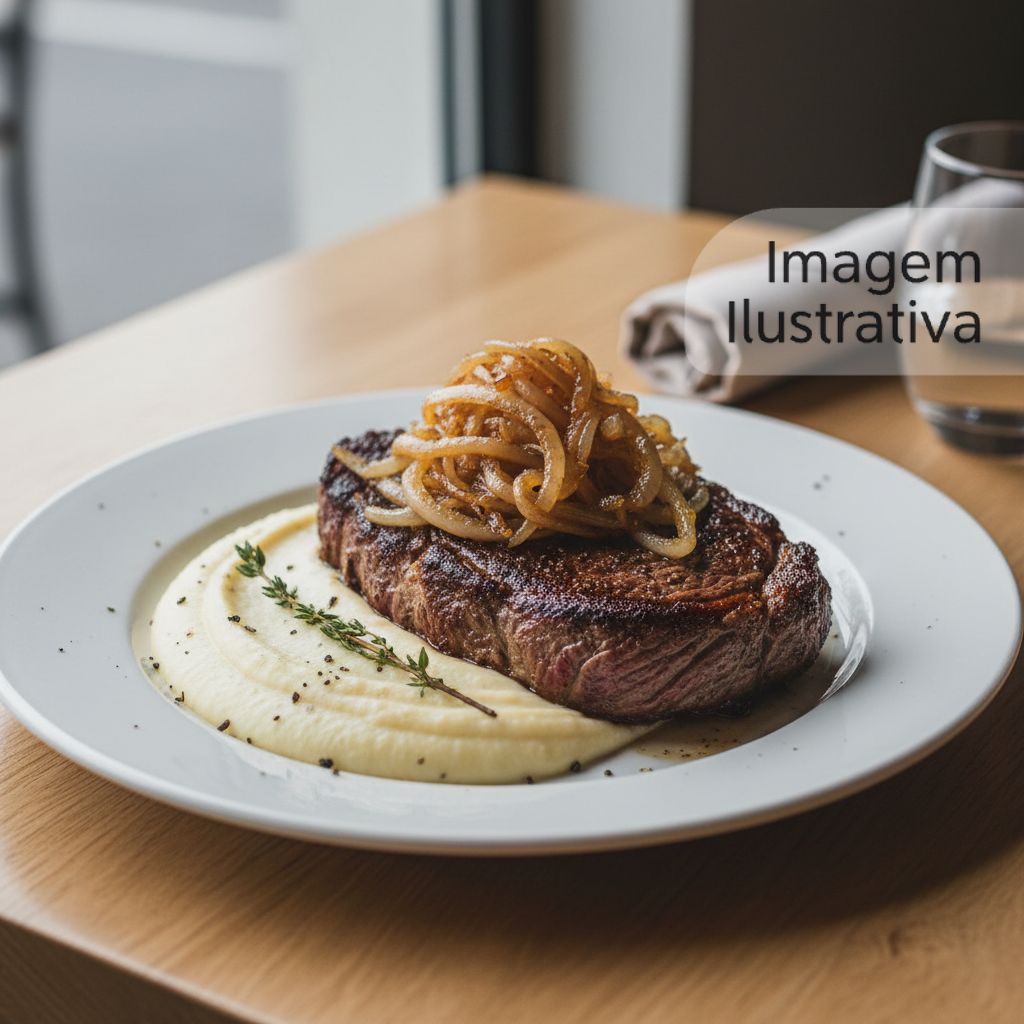 Bife acebolado suculento servido com purê de couve-flor cremoso, ideal para um almoço leve.
