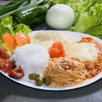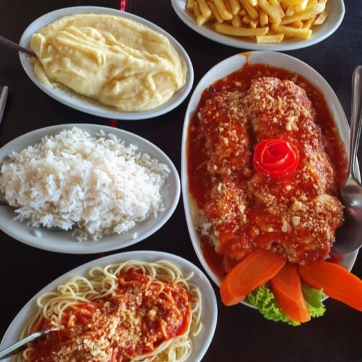 File a parmegiana- carne, tomate com manjericão, espaguete ao sugo, purê de batata e arroz branco.