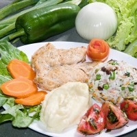 peito de frango grelhado, tomate com manjericão, cenoura cozida, purê de batata e arroz a grega.