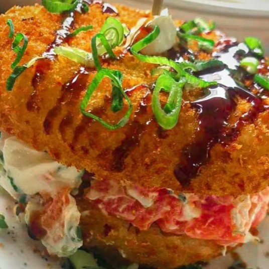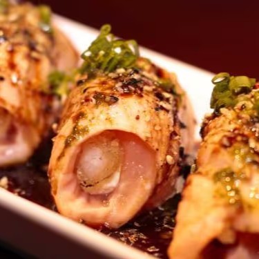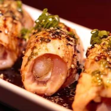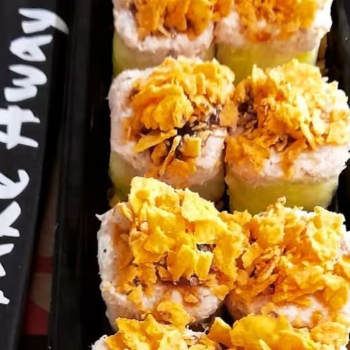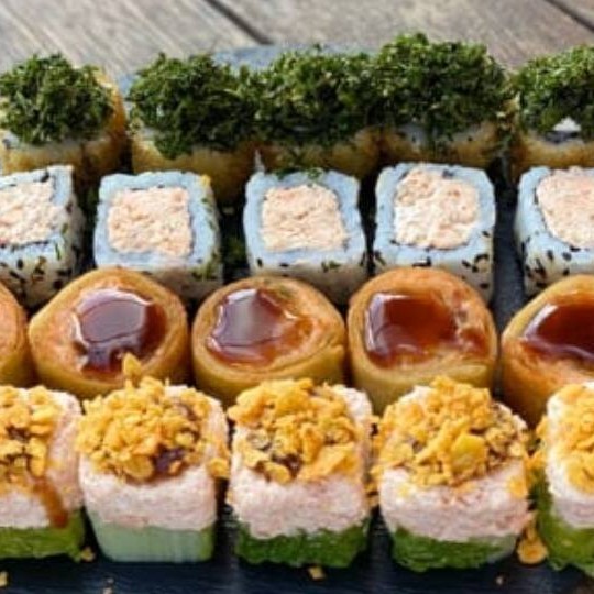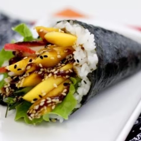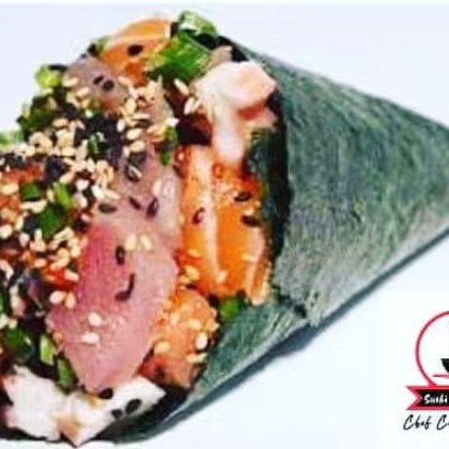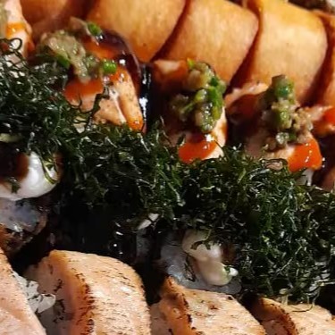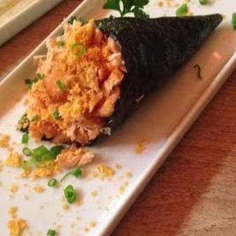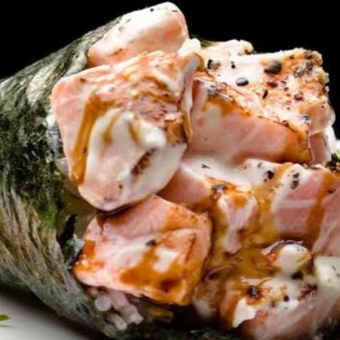 Enrolado de alga nori c/ arroz japones frito recheado c/ salmão grelhado + cream shesse cebolinha naxos ao nosso delicioso molho tarê da casa .