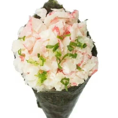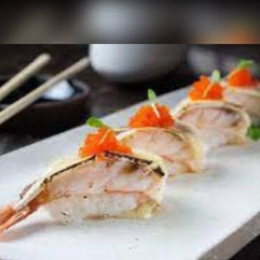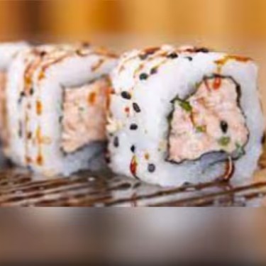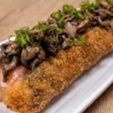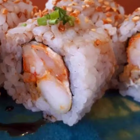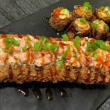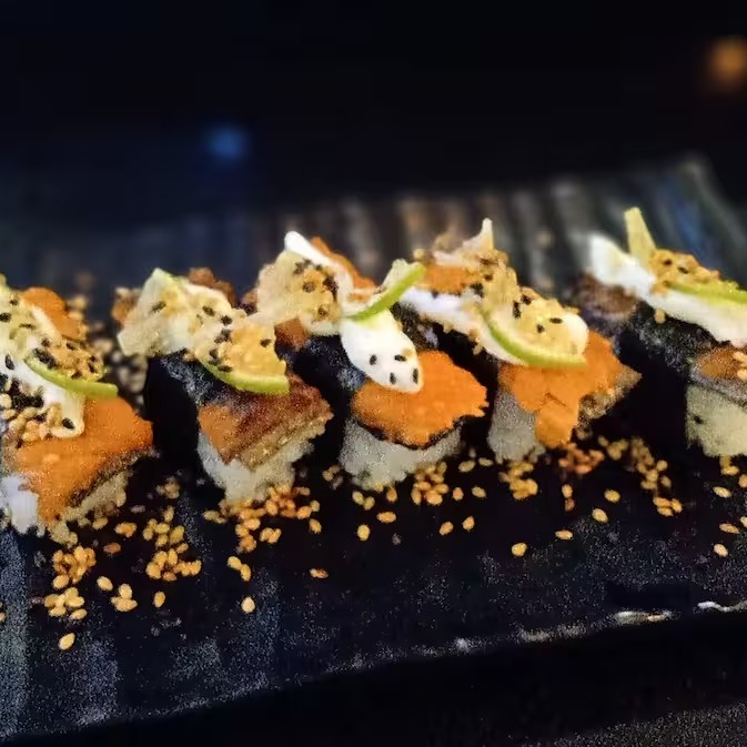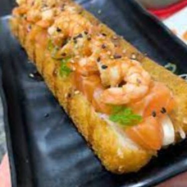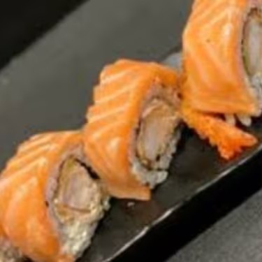 Enrolado c/ arroz por fora da alga nori , coberto com gergelim dourado , recheado com camarão empanado , cream shesse e coberto c/ lamina salmão ao aroma trufa branca .