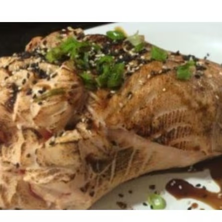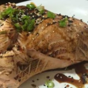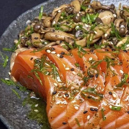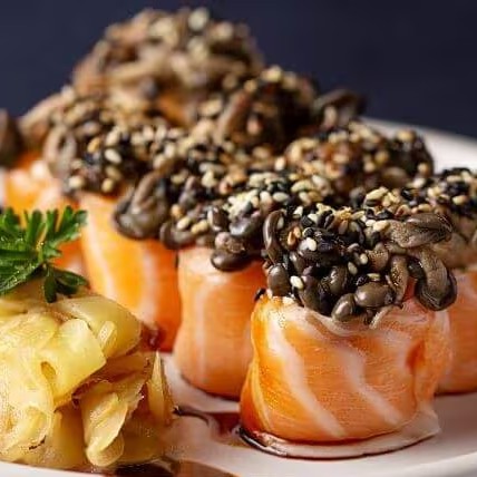 Cogumelo c/ molho especial no sakê manteiga , cebolinha c/ 6 fatias de salmão fresco levemente massaricado , gergelim cebolinha teriaki.