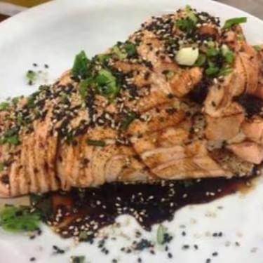 Arroz gonhan , salmão grelhado c/ cream shesse em volto lamina de salmão flambada, molhos teryaki , ervas , geleia de rubras cebolinha .