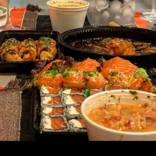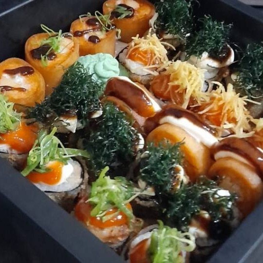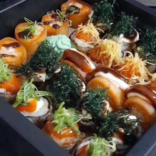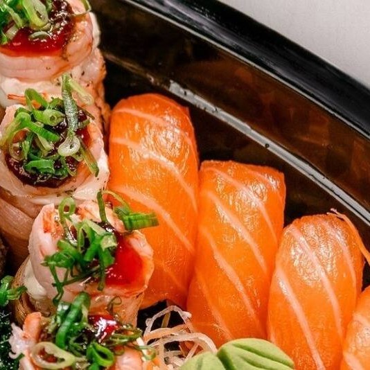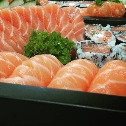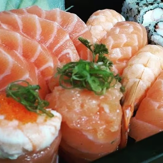 03 sashimi de salmão + 03 sashimi atum + 04 uramaki de salmão grelhado + 02 niguiri salmão + 02 niguiri camarão + 02 gunkan de salmão + 04 acelga make.