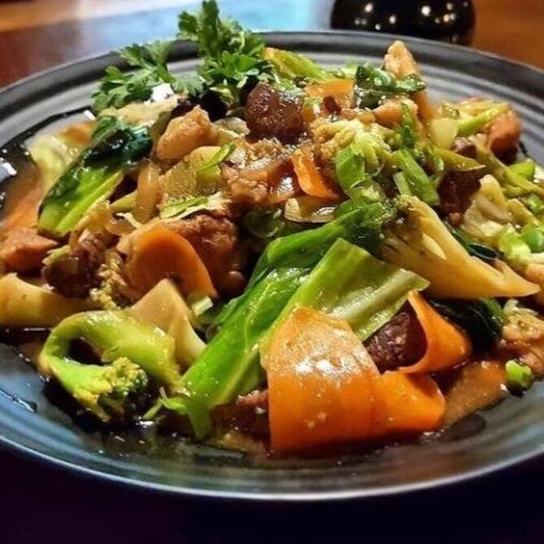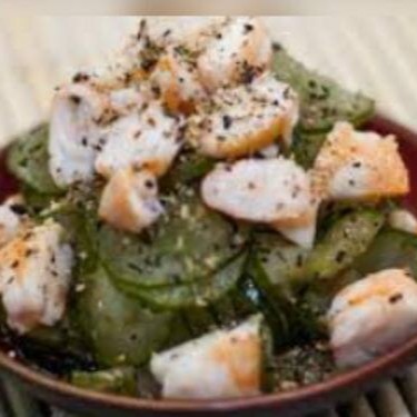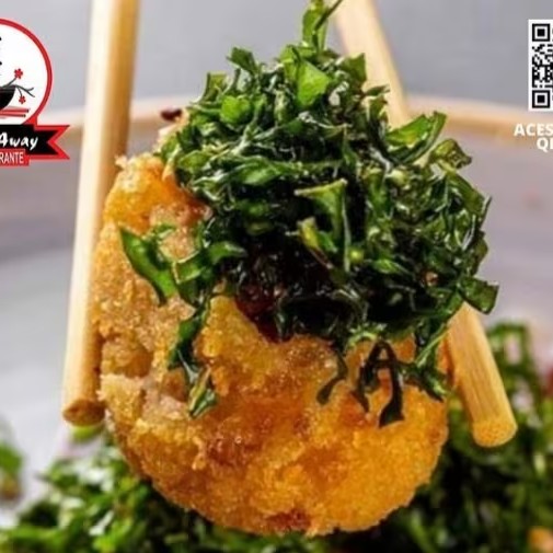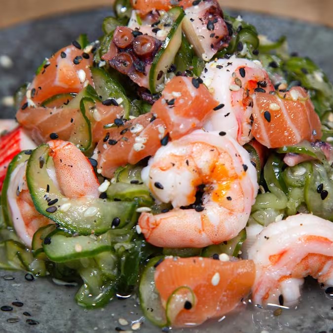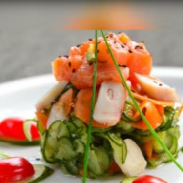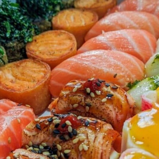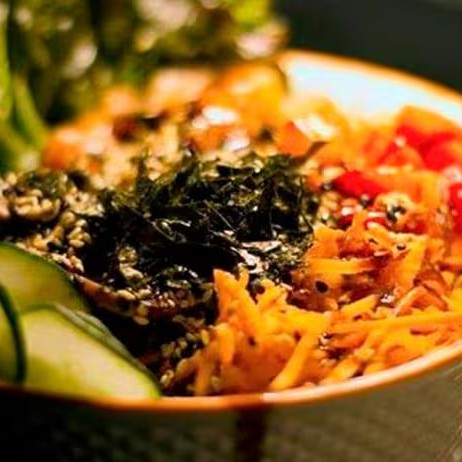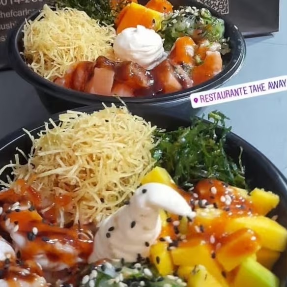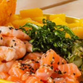 Base Arroz gohan (100g) camarão (50g) salmão em cubos (50g) sunomono ,couve frita,manga,gergelim ,batata doce crispy ao molho Tare .