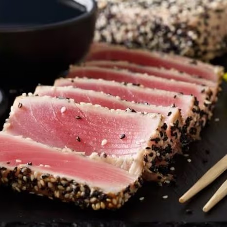 Lombo de atum fatiado selado com crosta de gergelim, sal temperado e teriyaki.