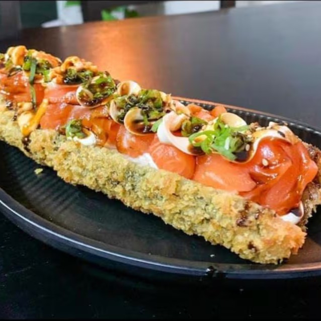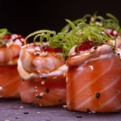 Arroz envolto na lamina de salmão flambado com recheio de camarão + cream cheese.