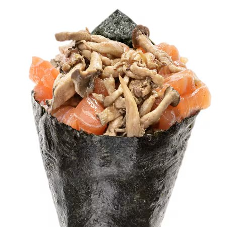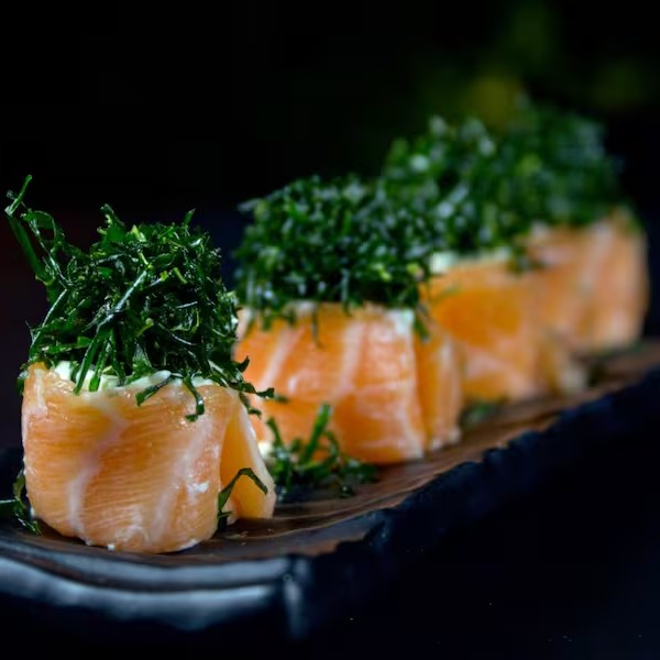 Sushi enrolado em uma fatia de salmão c/ recheio de shimeji + cream cheese com um toque de cebolinha