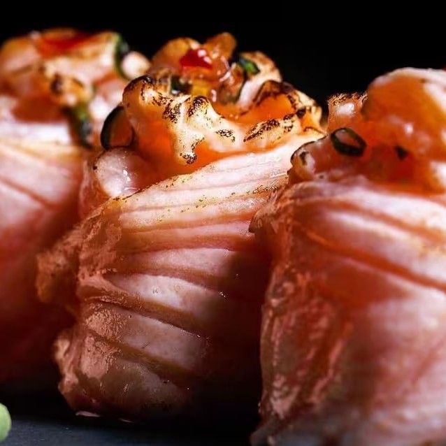 Sushi envolto na lamina de salmão flambado c / recheio de salmão fresco com um toque de gergelim e cebolinha.