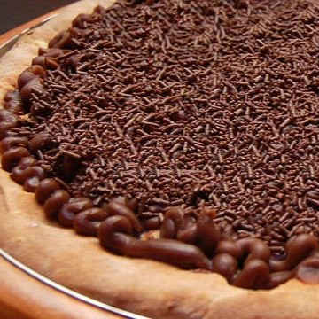 Pizza de Brigadeiro preparada com massa tradicional, coberta com mussarela levemente derretida, chocolate cremoso, brigadeiro macio e um toque especial de leite condensado, criando uma combinação ultra doce, cremosa e irresistível.