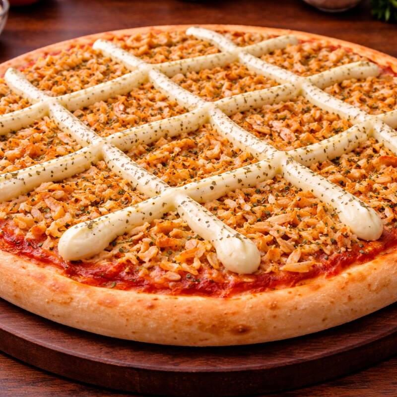 Pizza Frango com Catupiry preparada com massa tradicional, coberta com molho de tomate especial, mussarela derretida, frango desfiado suculento, catupiry super cremoso e orégano aromático, criando uma combinação clássica, cremosa e extremamente saborosa.