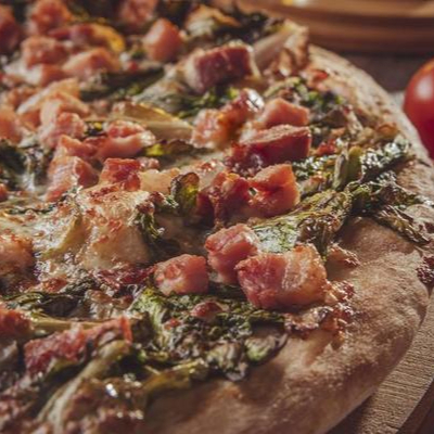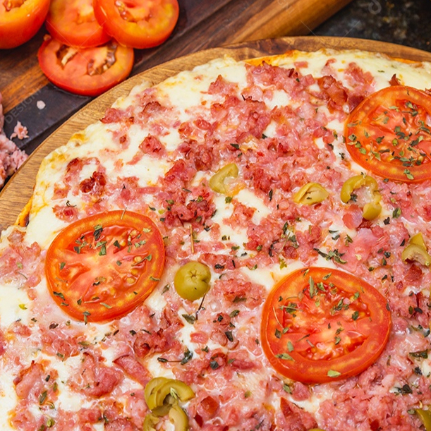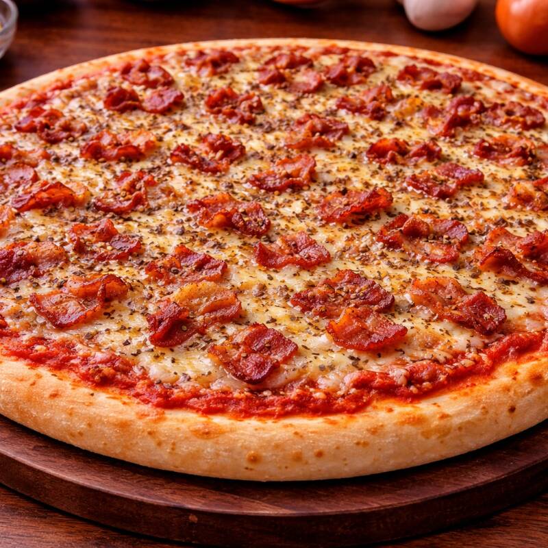 Pizza de Bacon preparada com massa tradicional, coberta com molho de tomate especial, mussarela derretida, bacon crocante e orégano aromático, criando uma combinação intensa, suculenta e cheia de sabor.