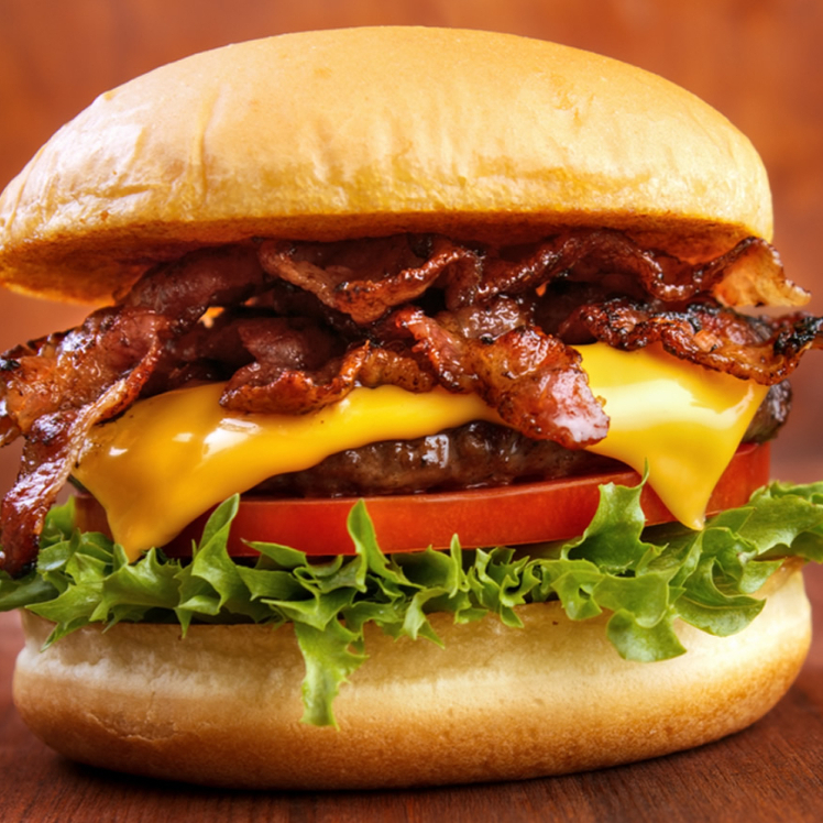 X-Bacon preparado na hora, com hambúrguer suculento e bem temperado, bacon crocante, queijo derretido, presunto e salada fresca e crocante, criando uma combinação intensa