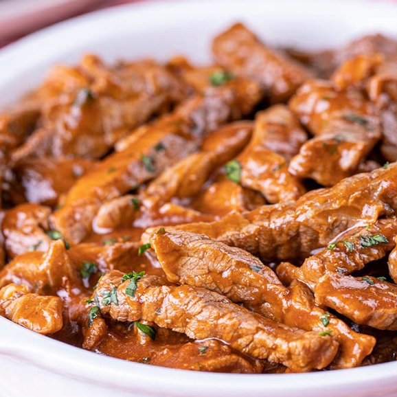 Marmita de Isca de Carne ao Molho Madeira preparada na hora, com iscas de carne macias e suculentas, envolvidas em um molho madeira encorpado e cheio de sabor, trazendo uma experiência sofisticada e irresistível. Acompanha arroz temperado soltinho, macarrão saboroso, feijão tropeiro caprichado e salada verde fresquinha