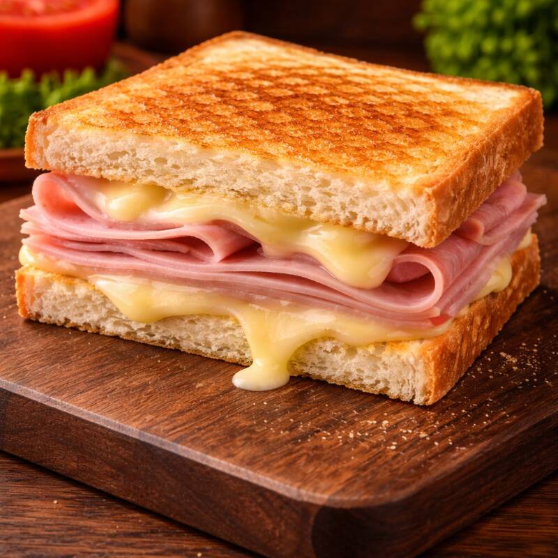 Misto R preparado na hora, com queijo derretido e cremoso e presunto saboroso, formando uma combinação clássica, simples e irresistível.