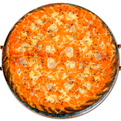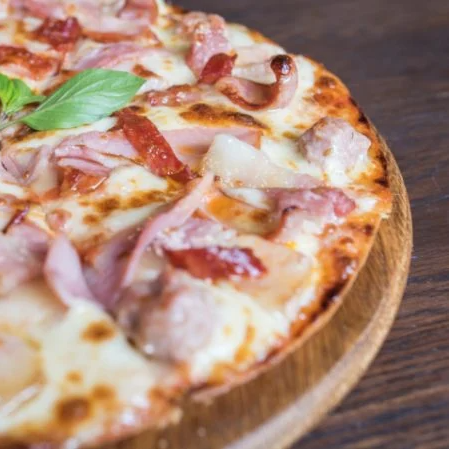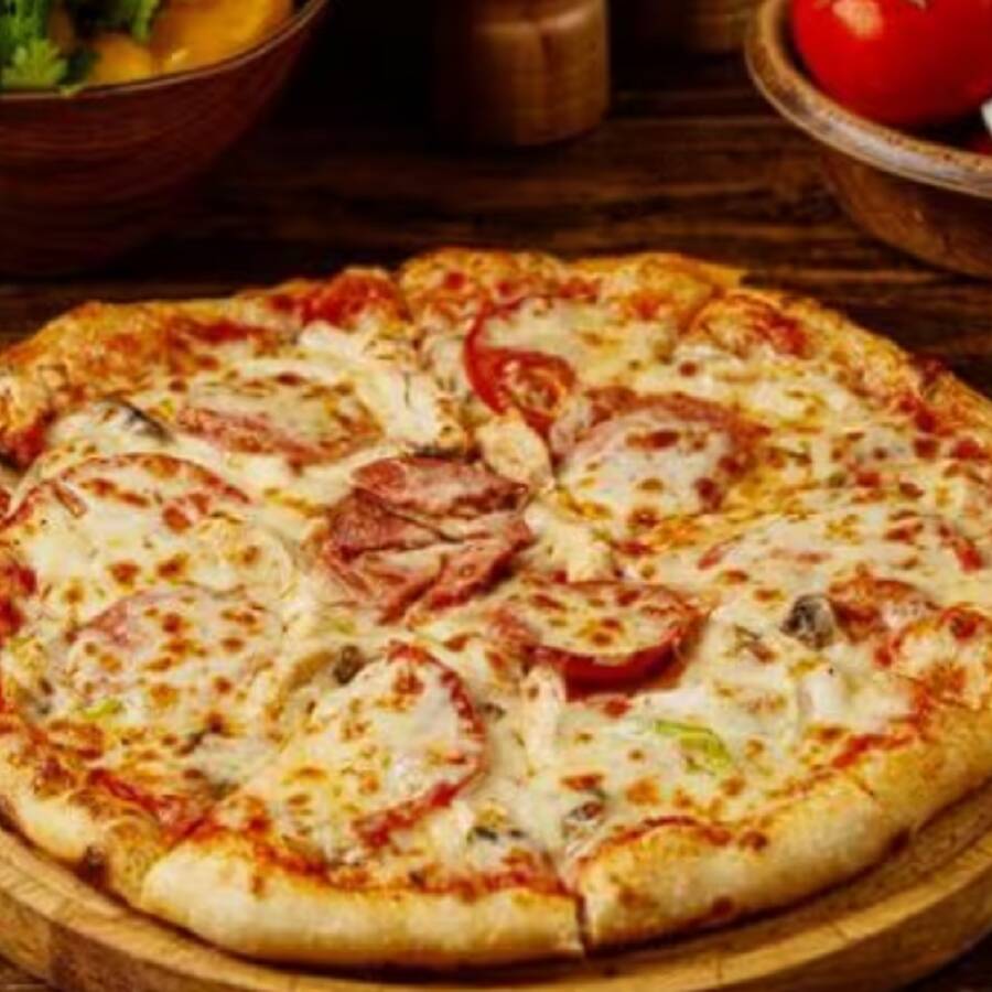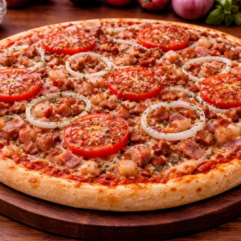 Pizza Brasileira preparada com massa tradicional, coberta com molho de tomate especial, mussarela ralada super derretida, presunto selecionado, lombinho suculento, bacon crocante, tomate fresco, cebola e orégano aromático, criando uma combinação rica, generosa e incrivelmente saborosa