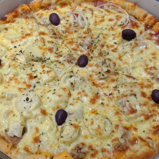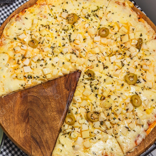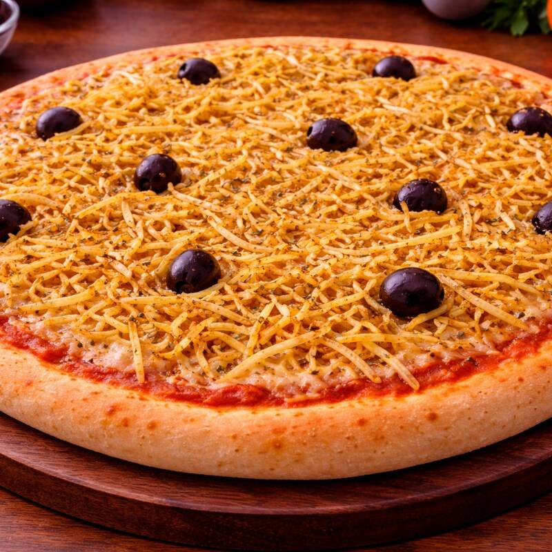 Pizza de Cheddar preparada com massa tradicional, coberta com molho de tomate especial bem temperado, mussarela super derretida e cremosa, cheddar cremoso e envolvente, azeitonas selecionadas e orégano aromático, criando uma combinação intensa, cremosa e cheia de sabor