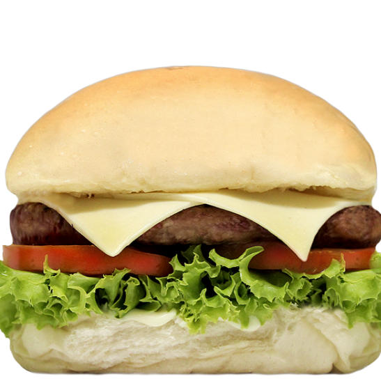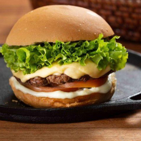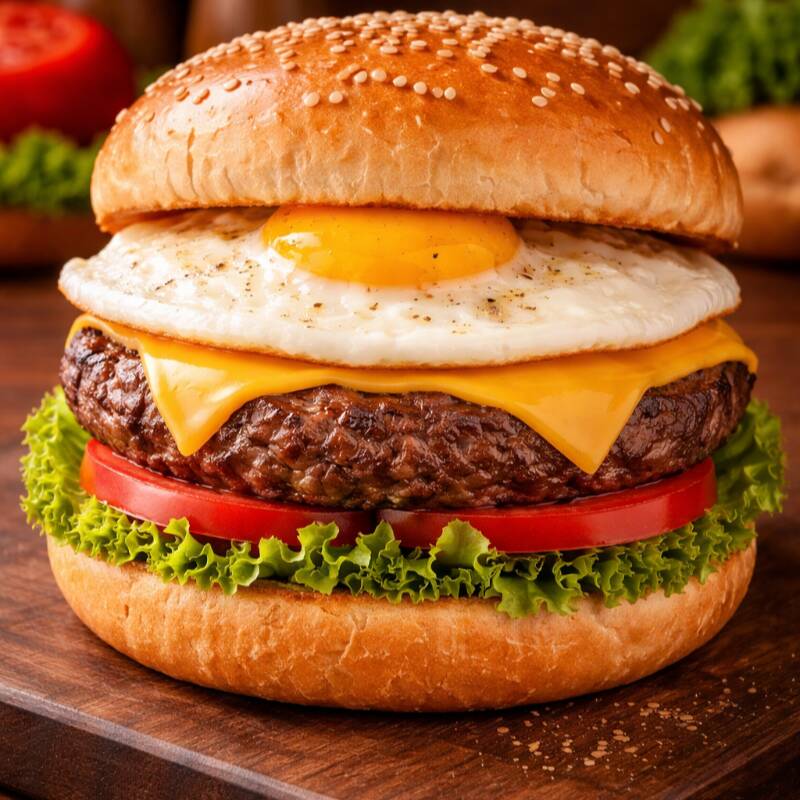 Burguer Americano preparado na hora, com hambúrguer suculento e bem temperado, ovo fresquinho e salada fresca e crocante, criando uma combinação clássica, leve e cheia de sabor.