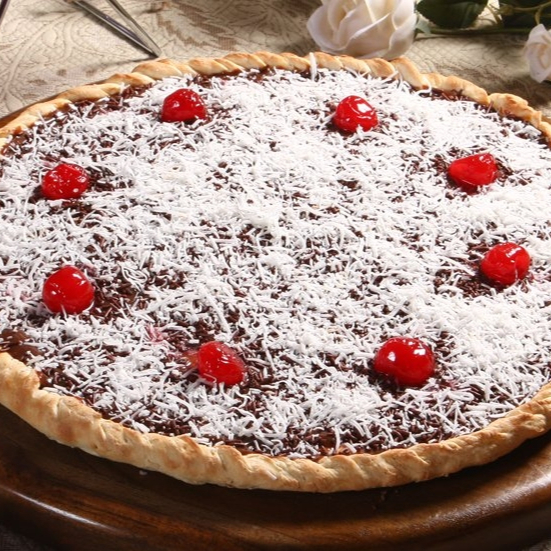 Pizza de Prestígio preparada com massa tradicional, coberta com mussarela levemente derretida, chocolate cremoso, coco ralado e um toque especial de leite condensado, criando uma combinação doce, intensa e irresistível.