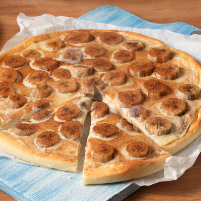 Pizza de Banana com Canela preparada com massa tradicional, coberta com mussarela levemente derretida, banana fresca e macia, leite condensado cremoso e canela aromática, criando uma combinação doce, cremosa e irresistível.
