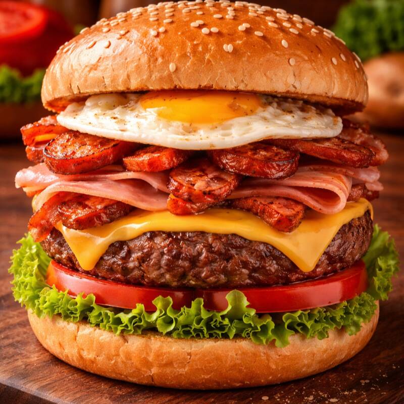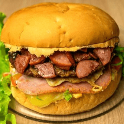 Burguer da Casa preparado na hora, com hambúrguer suculento e bem temperado, calabresa fatiada, bacon crocante, ovo fresquinho, queijo derretido, presunto e salada fresca e crocante, criando uma combinação completa, intensa e cheia de sabor.